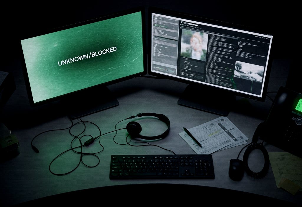 Six other desks sat in the gloom around her. Empty chairs were pushed in. Headsets rested on keyboards like sleeping bats. The shift rota said she was alone. The room felt watched. The black monitors of the other desks acted like mirrors. They repeated the room back to itself in an infinite loop.