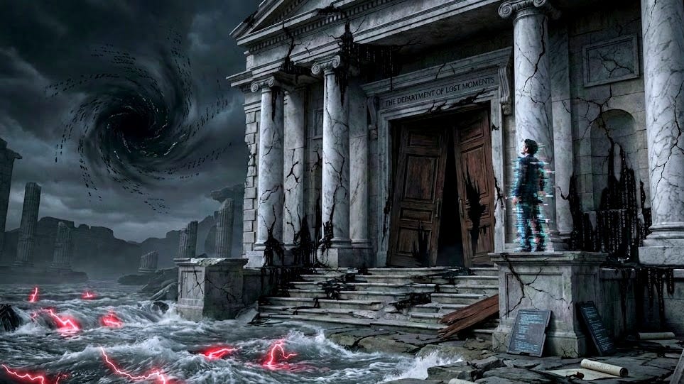 The plinth came to an abrupt, shuddering halt before a grand, imposing archway. The air here was heavy, thick with the smell of decaying paper and the faint, chemical tang of degrading data-slates. The entrance to The Department of Lost Moments. But the architecture was wrong. The polished marble was cracked, and dark, oily code seeped from the fissures like tar. The grand double doors of dark wood were splintered, hanging crookedly on their hinges.
