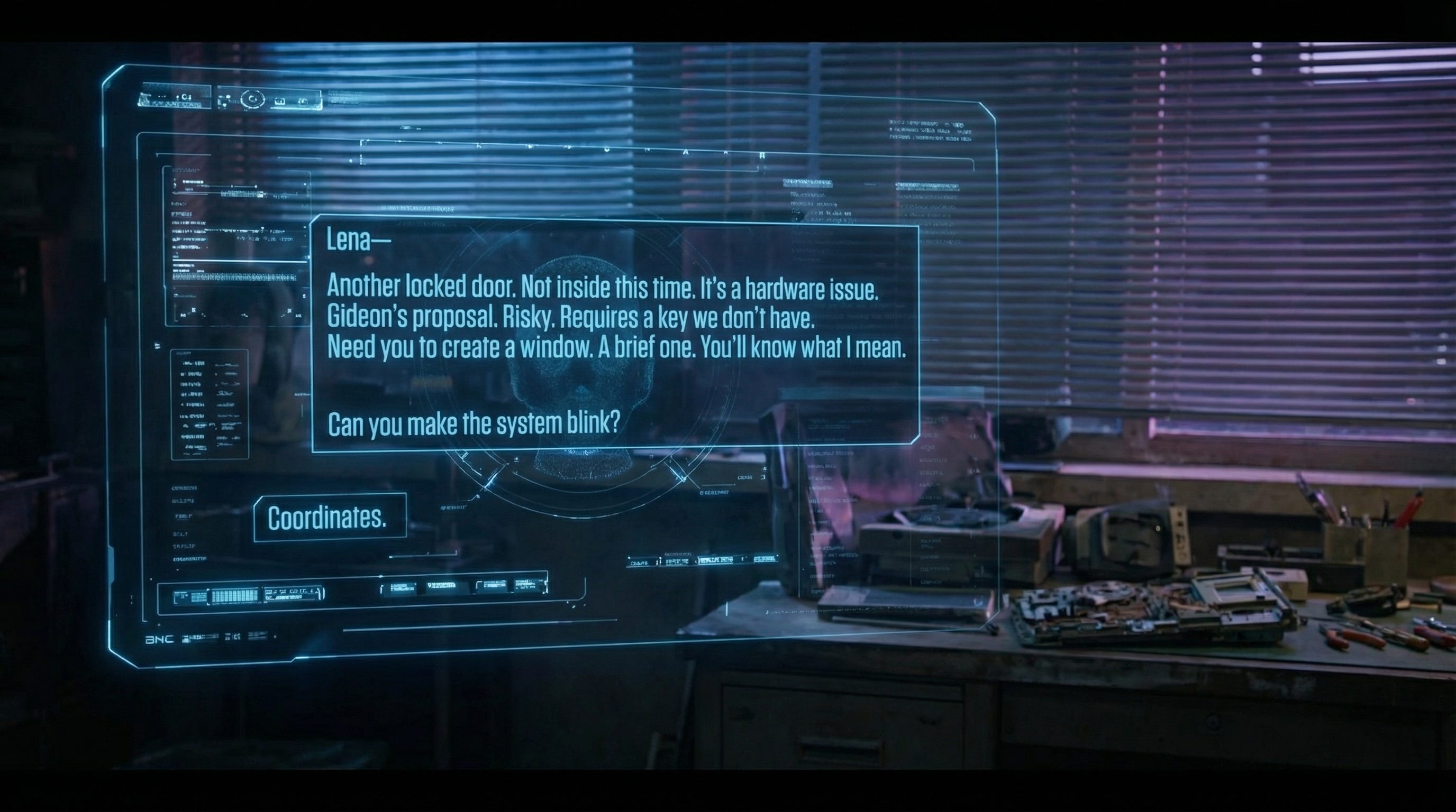 Gabe stared at it. Just that. Coordinates. Not a question, not an agreement, but a command. A demand for the first piece of the puzzle. It was a test. A power play. She was forcing him to commit, to send her the target information before she had even agreed to help. To hand over a piece of leverage. He could feel Gideon’s silent, analytical presence behind him, processing this new, calculated risk. He hesitated for only a second, the choice already made by the sheer, crushing weight of his desperation. He sent the hardware signature of Alice’s pod, the data a cold, sterile string of characters that felt like a betrayal in itself.