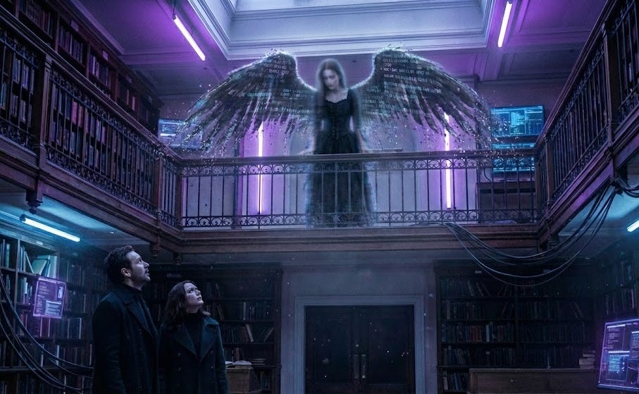 Above them, on the railing, stood a figure. A woman, blurred at the edges. She looked like a projection struggling to hold its form. Vast wings of fractured, shimmering light unfolded from her back. They were not built for flight. They were an expression of pure, static-edged sorrow. Feathers of memory and broken code drooped, heavy and defeated. Their edges dissolved into faint, glittering motes.